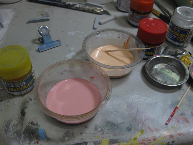 肌色の調色です。 美少女フィギュアでは特に気を遣うのがコレです。 キャラクターの個性に合わせてクールホワイトをベースに、クリアーのレッド、イエロー、オレンジを混ぜます。 影になる部分はややピンク気味にします。 ヌードモデルの製作になると更に2種類ほど肌色を作り分ける必要が出てきます。 ですが、なかなか一発で色が決まらないので、コピー用紙やケントブロック、プラ板などに試し吹きを繰り返し、色を作ります。 失敗した色が大量になる上、成功した色は後々のリタッチ修正、まさかの時の塗り直しなども含め大量に作らなければならないという矛盾もあるため、 かなり塗料を消費してしまいます。 吹いた時イメージよりもほんの少し濃いめに調色するのと、吹いたときにちょうど良くなります。 また、影の部分は調色した肌色を少し分けてもらい、それにクリアーレッド、クリアーオレンジ等を混ぜていく方法をとると、色に統一感が生まれます。 |